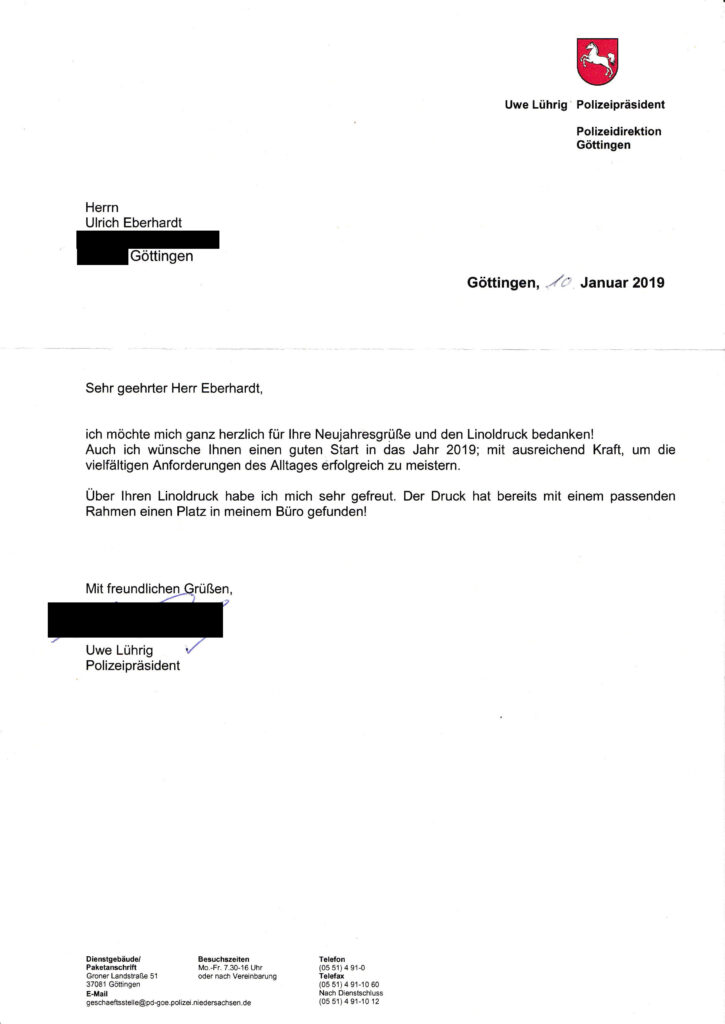 Ich hatte mich in meiner Not einmal an den Göttinger Polizeipräsident gewannt, weil ich das alles nicht verstehen konnte, was Neonazis für Sonderechte in Göttingen zu haben schienen. Es gab dann ein Telefonat für das ich mich mit einem Kunstdruck bedankte, was Uwe Lührig dann zu einen Brief bewegte. Zwei Monate später standen dann wieder Neonazis bei mir vor der Haustüre[3]. Ich wurde wie einige andere Menschen über mehrere Monate psychisch durch Neonazis u.a. auf facebook gedemütigt, aber auch durch einen aus der Kasachstan stammenden, schwer drogenabhängigen Nachbar terrorisiert, ohne das es durch mich zu offensichtlich gewollten Gegenreaktionen kam. Dennoch wurde ich unschuldig Strafverfahren ausgesetzt und habe für den Zeitraum ab 2013, viele Eintragungen „gesammelt“. Ein vorläufiges Ende fand das, als ein Richter und Kirchenmann ein durch einen bekannten Göttinger Widerstandsbeamten (der auch im Ruhestand ist) ausgelöstes Strafverfahren gegen mich, in der Berufungsverhandlung am Landgericht einstellte.