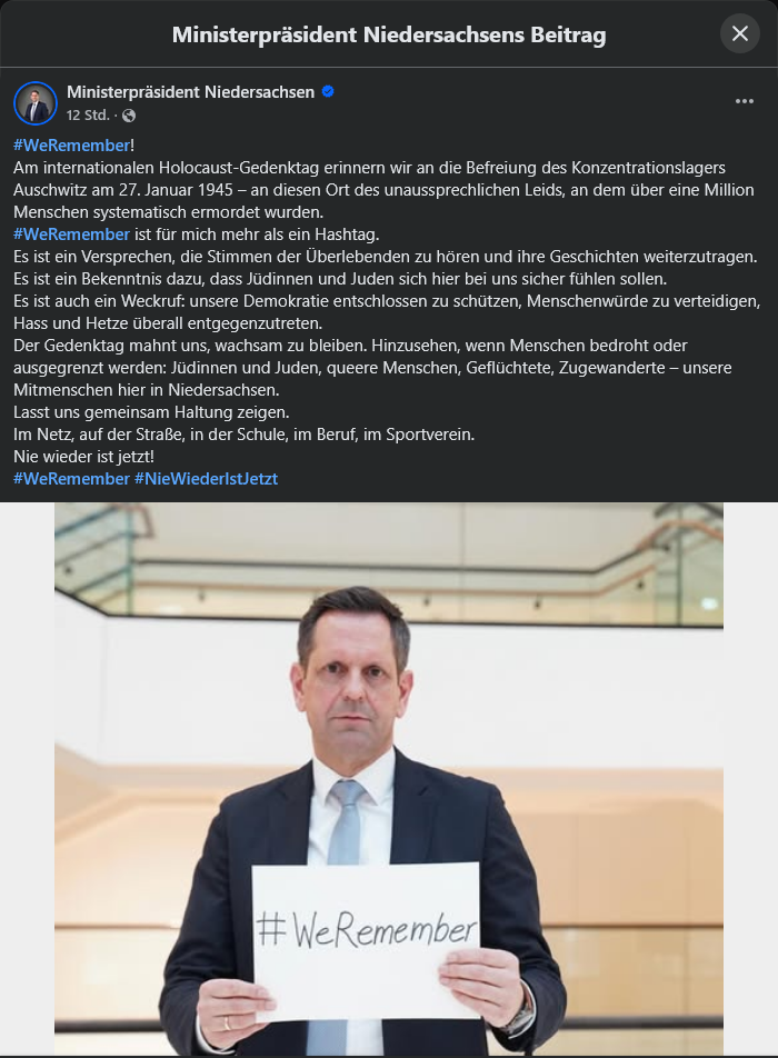 Die Worte des niedersächsischen Ministerpräsidenten Olaf Lies anlässlich des Holocaust Gedenktags mit Leben füllen, dass ist eine Aufgabe der demokratischen Zivilgesellschaft! #WeRemember!